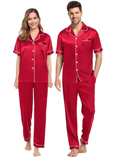 - COUPLES SATIN PAJAMA SETS - Short sleeve pjs is made of satin with some stretch touch, silky-smooth, very softly and comfy. Lightweight and skin-friendly material care for people's health.