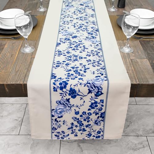 - ELEGANT AND INTERESTING: This embroidered table runner with delft blue onion flowers on a white background will spruce up your table or buffet for any event.